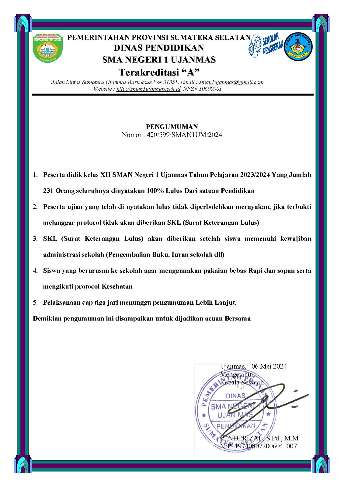 Pengumuman Kelulusan XII SMAN 1 Ujanmas Tahun 2023/2024